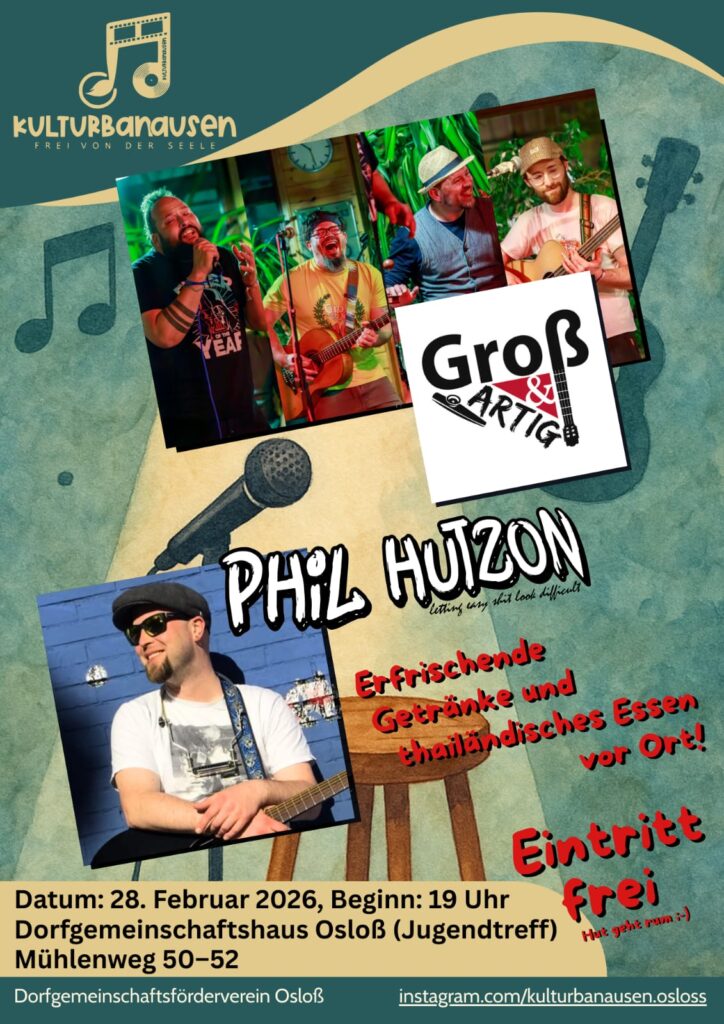 Eine Gruppe von feierwütigen Einwohnern hat es sich zur Aufgabe gemacht die Facetten des kulturellen Angebots zu erweitern. Der großartige Phil Hutzon und wir haben die Ehre, auf dem zweiten Konzert überhaupt, euch zu unterhalten.